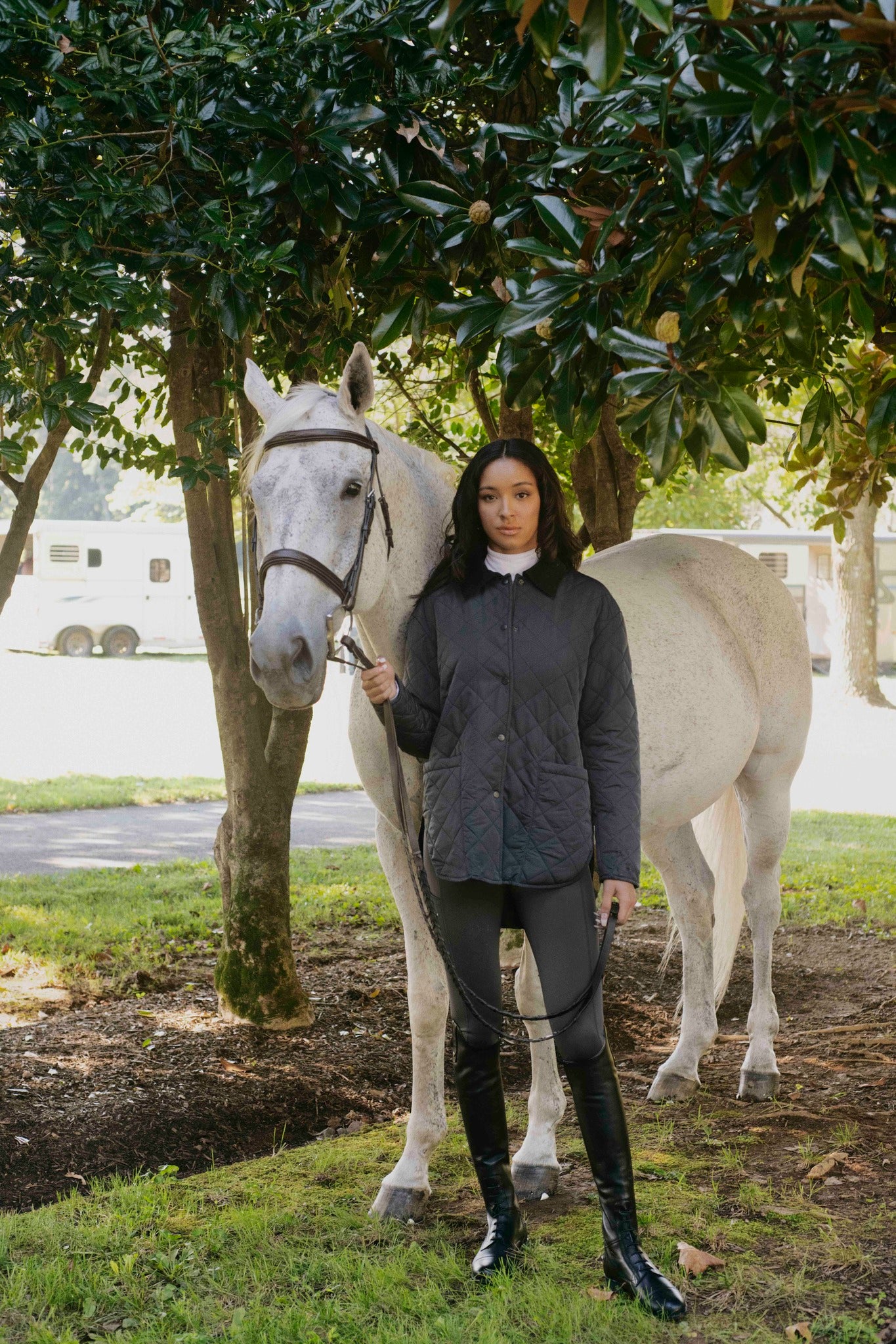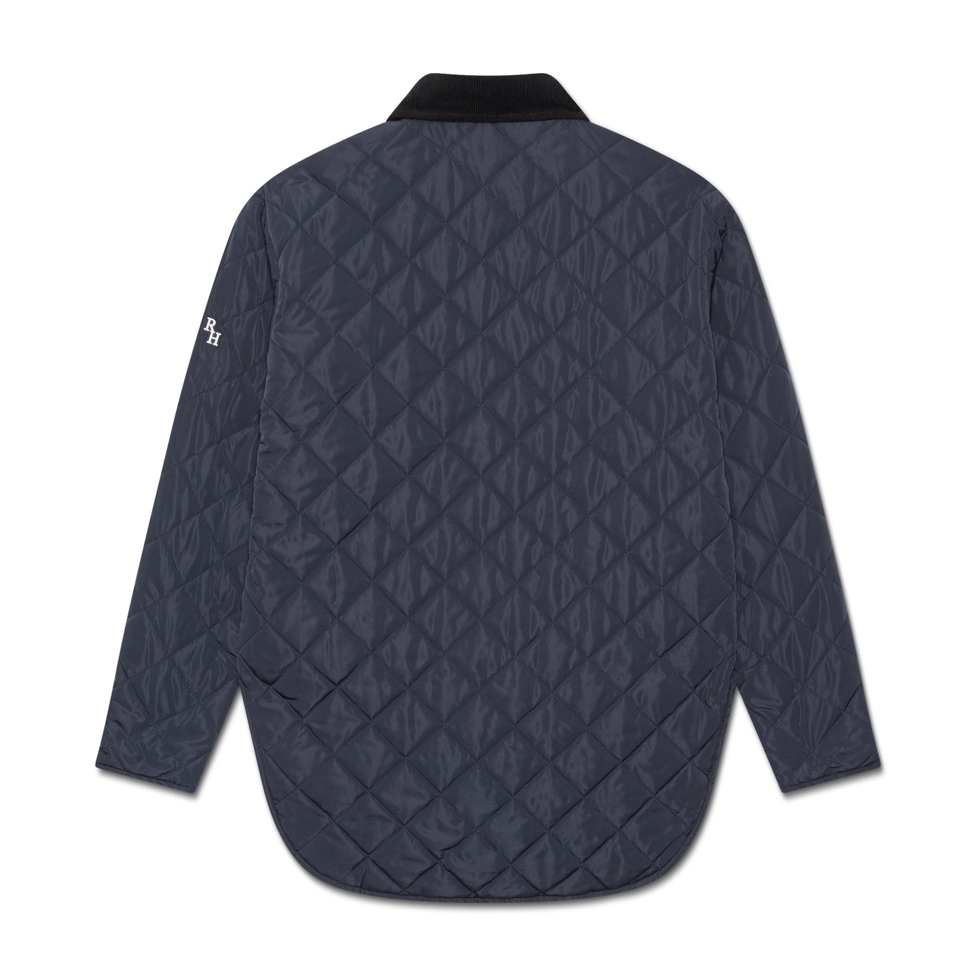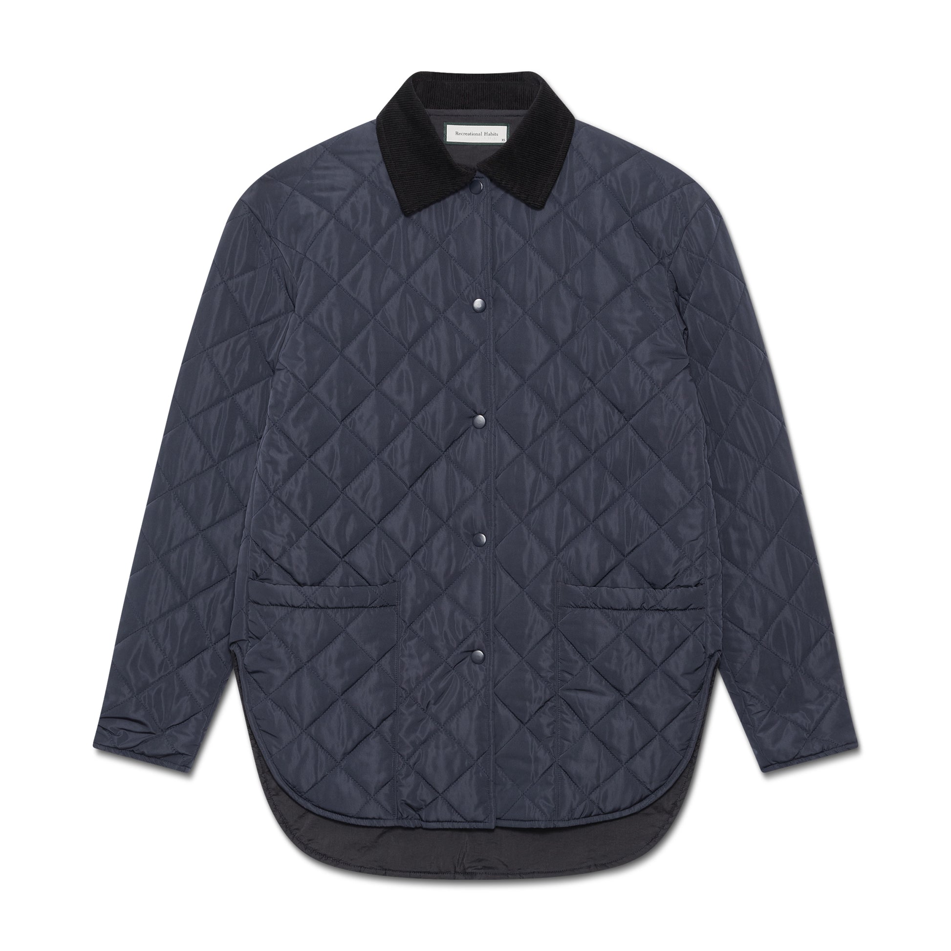 Sammy is a soft filled diamond quilted long jacket with black corduroy collar. Raised RH embroidery on bicep. Deep hand pockets.