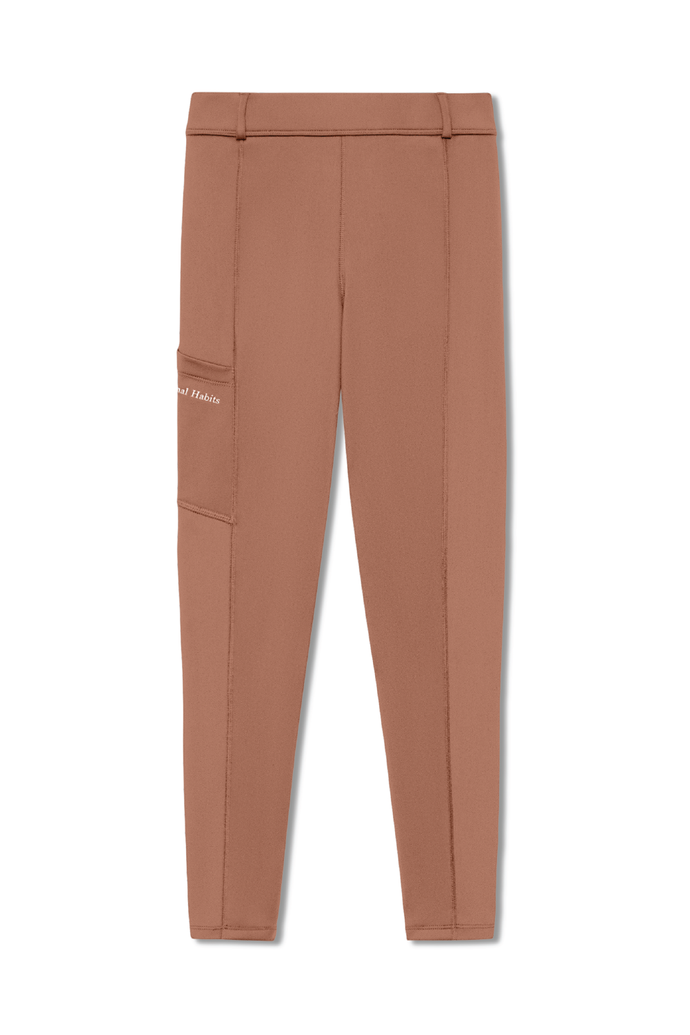 Fleece-back legging. Pull on waistband, slide in phone pocket at thigh. Raised Recreational Habits artwork on pocket. Perfect for any winter sports like riding or ski.