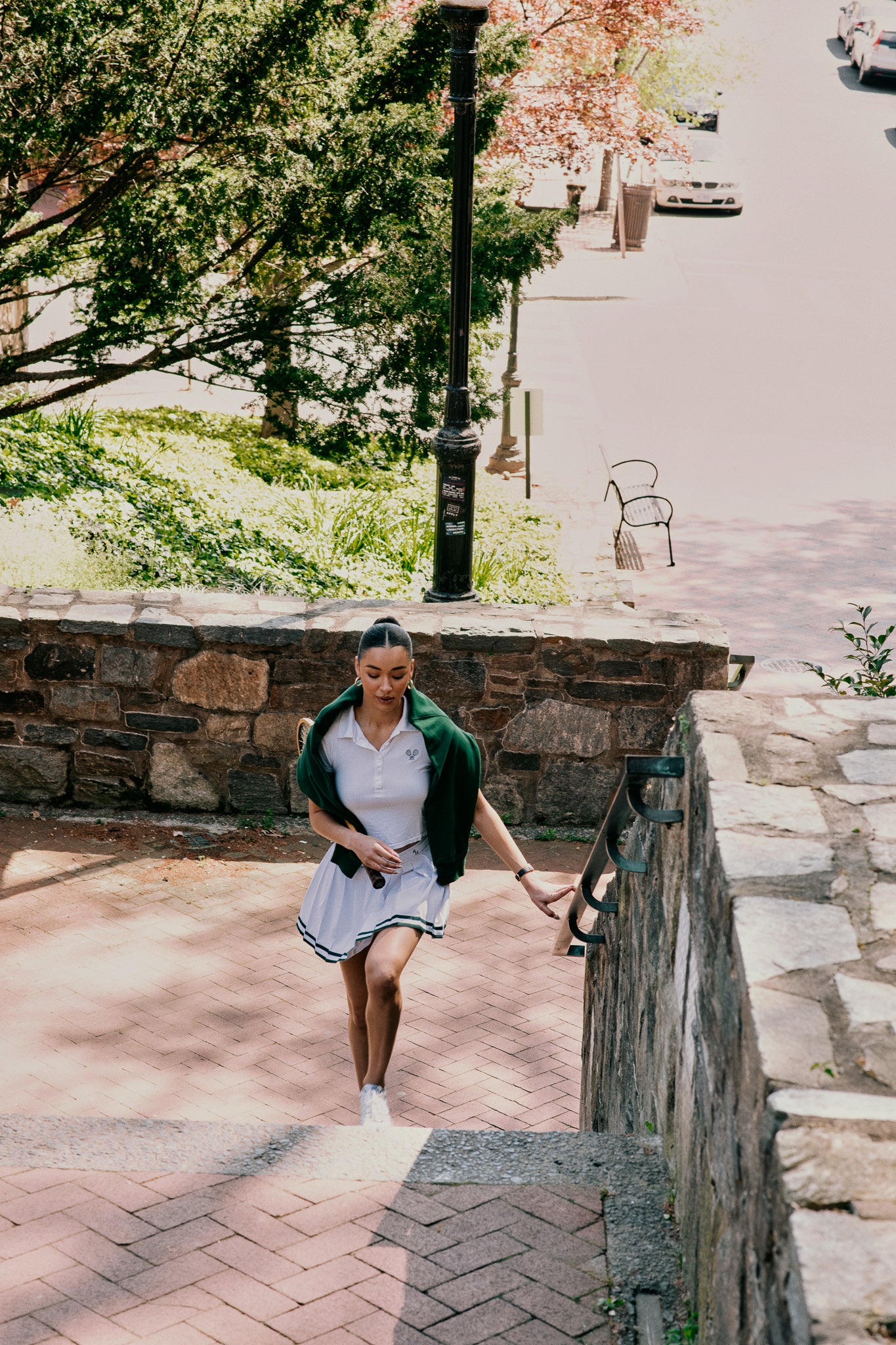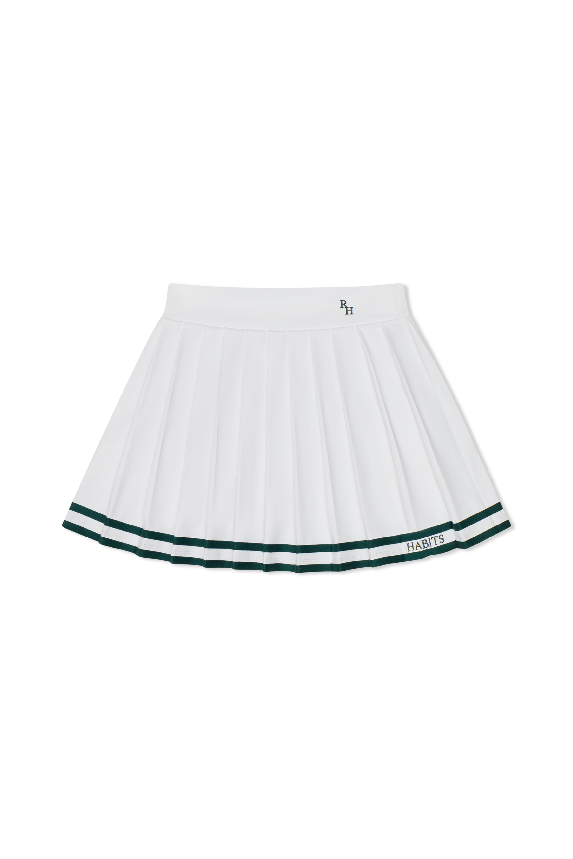 The Natasha skirt is an update to our best-selling tennis skirt with flattering green piping and an attached ball short. The style features an elastic waistband and embroidered details at bottom hem and waist.