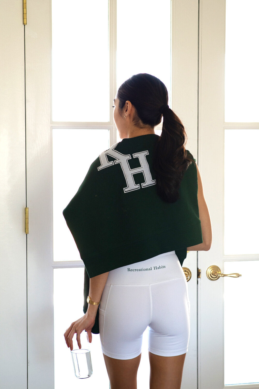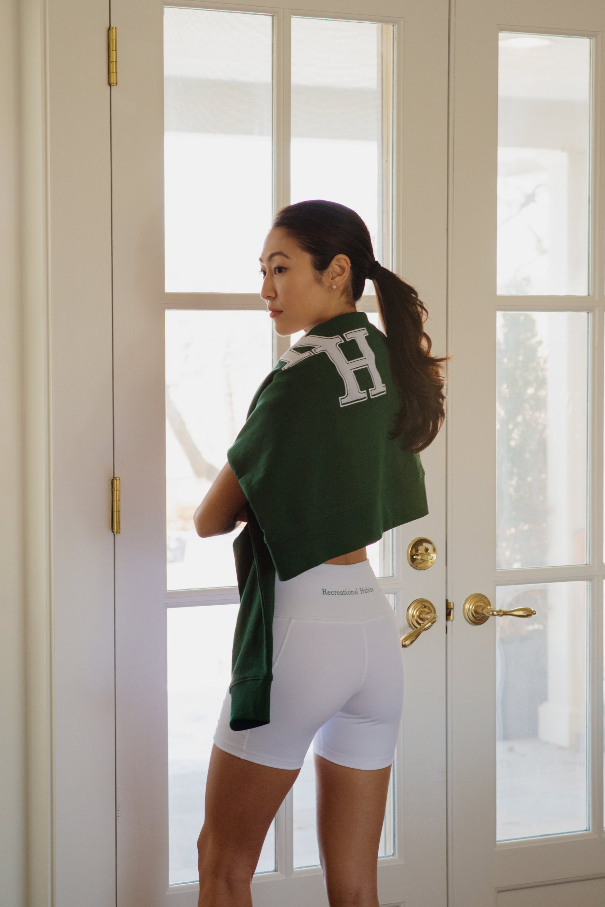 High Waisted Mini Biker Short in White with side pockets. Printed Recreational Habits in Green across the lower back. Designed to wear as a set with the Active Bra.